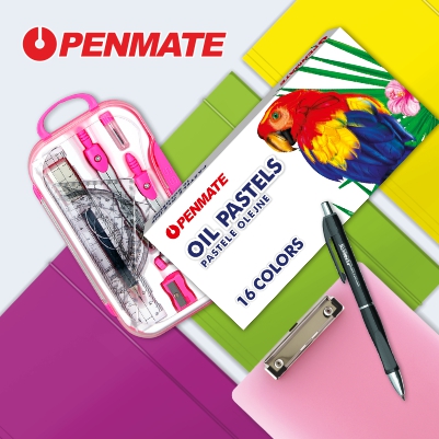 Marka Penmate to różnorodne produkty biurowo-szkolne takie jak długopisy, komplety piśmienne, korektory, ołówki, pastele, cyrkle, teczki z gumką, artykuły do archiwizacji z tworzyw sztucznych oraz artykuły z tektury własnej produkcji: teczki z rączką, teczki łamane, deski z klipem, segregatory i kołozeszyty.